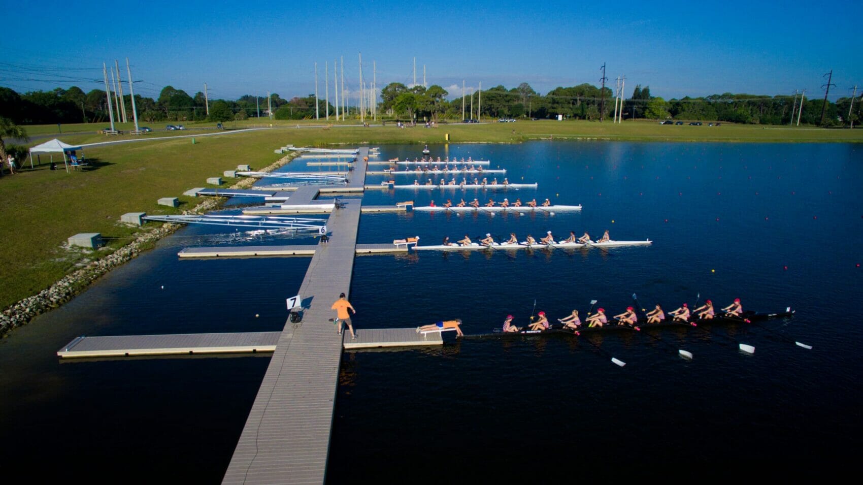 One of our most remarkable projects is the 10-lane floating start dock at Nathan Benderson Park in Sarasota, Florida. This world-class facility, located on the sunny west coast of Florida, has earned a reputation for hosting a wide range of prestigious rowing events. AccuDock had the honor of fabricating a 10-lane, 425′ long start dock, the first of its kind in the world.